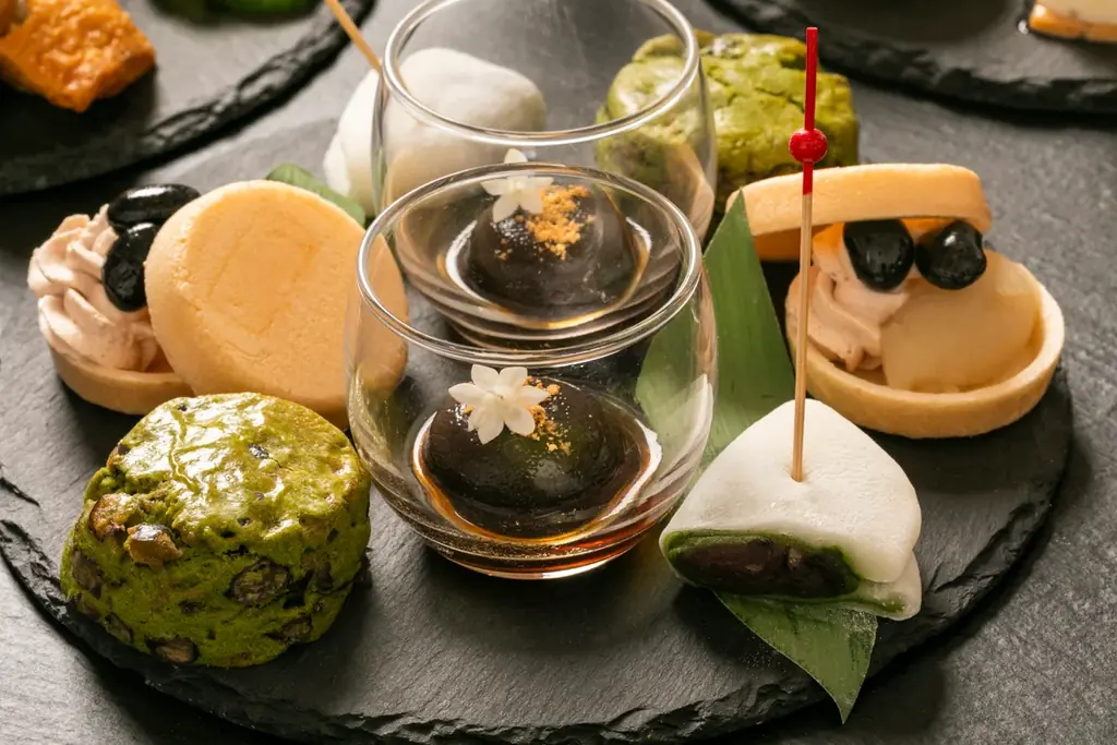 スイーツとセイボリーには、福寿園の抹茶、ほうじ茶、和紅茶などを用いたバリエーションを揃えている。抹茶の濃厚な苦味やほうじ茶の焙煎香、和紅茶のふくよかな甘みを活かしたスイーツと、抹茶味噌や昆布締めといった和の技法を取り入れたセイボリーが並ぶ。