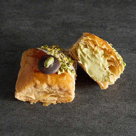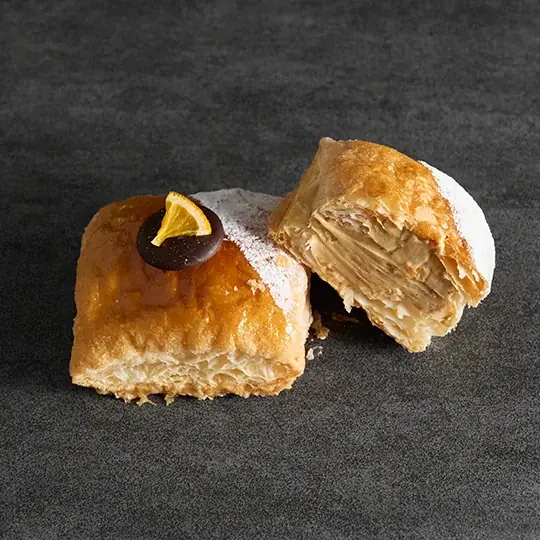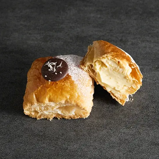 パイ生地は丁寧にバターを何度も練りこんだものをオーブンでふっくらと膨らませ、表面をキャラメリゼして香ばしさを強調。焼き上がりのバターの香りが豊かに立ち上り、食べた瞬間に違いが伝わる仕上がりです。カスタードは北海道産生クリームをたっぷり加え、なめらかさとコクを重視して作られています。