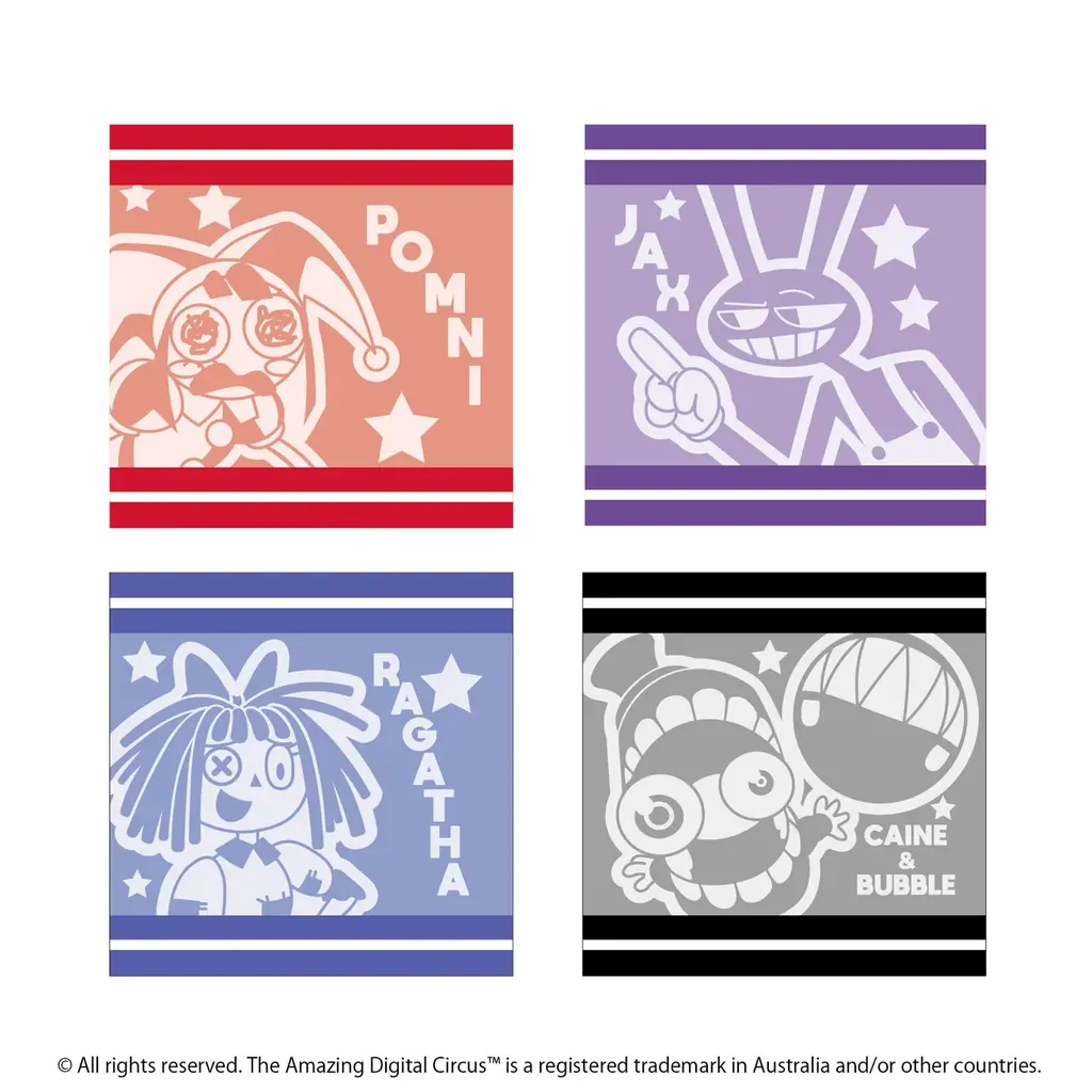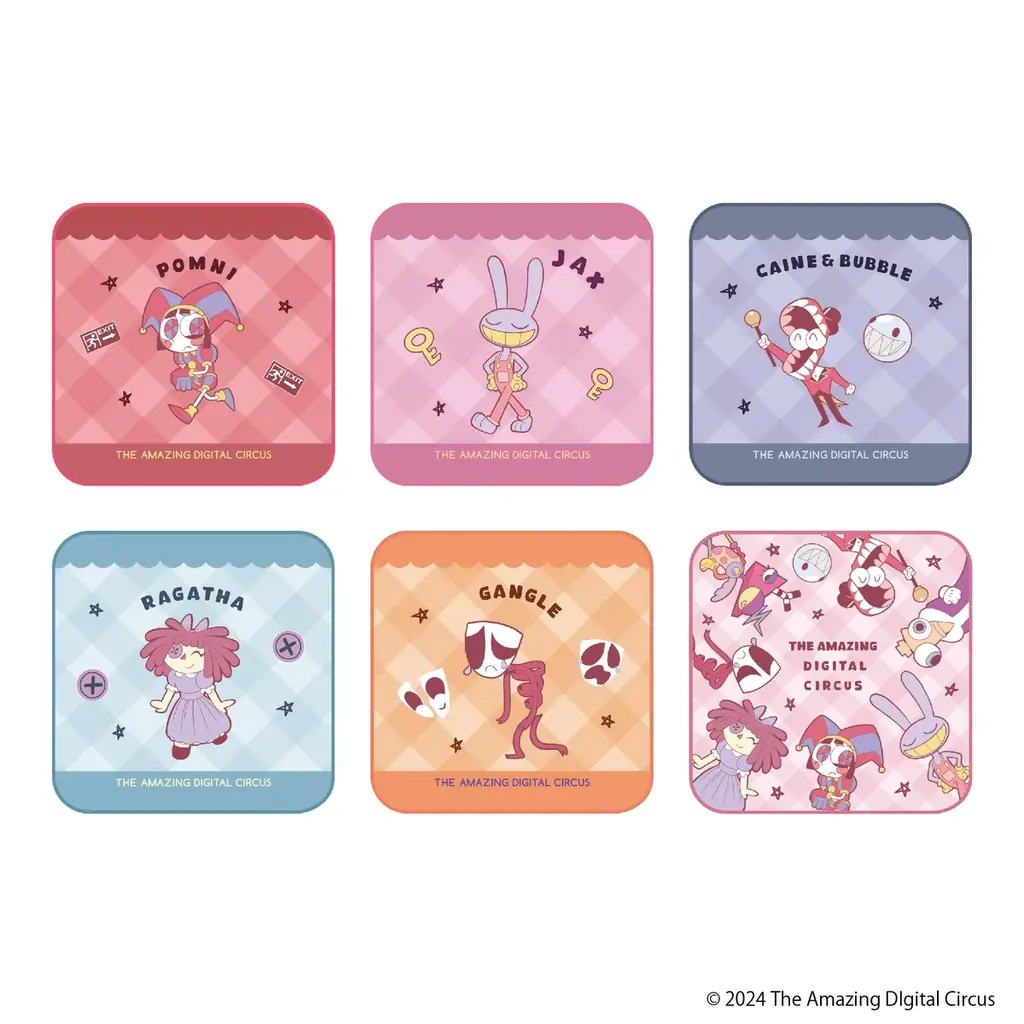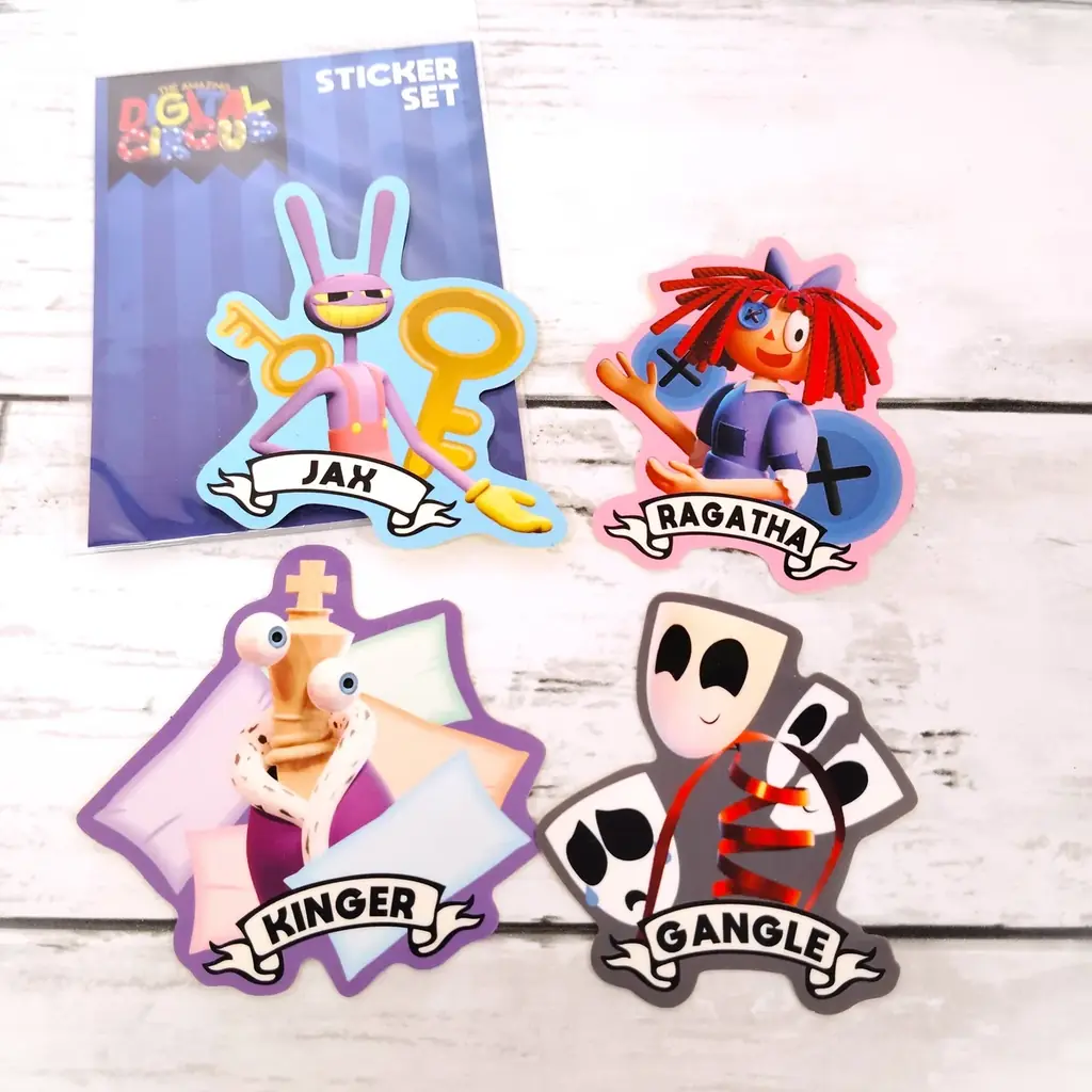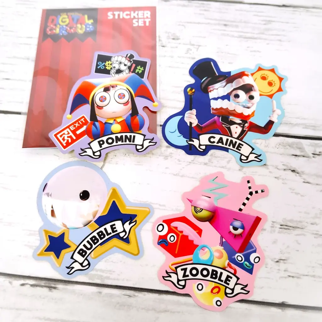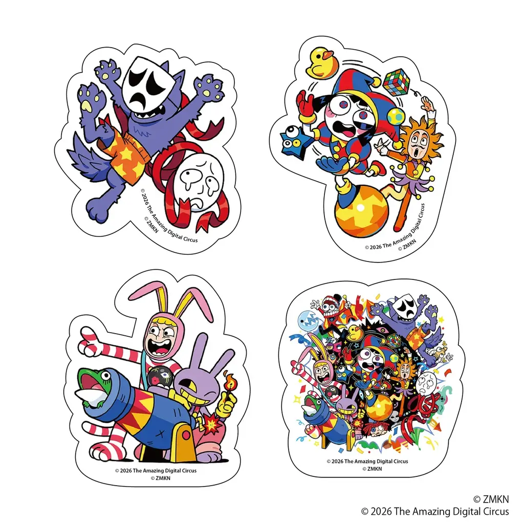 | ダイカットステッカー(4枚入り) A/B | A:ポムニ/ズーブル/ケイン/バブル、B:ジャックス/キンガー/ラガタ/ガングル | 各990円 | スマートフォンケースの背面に入れられるサイズ |