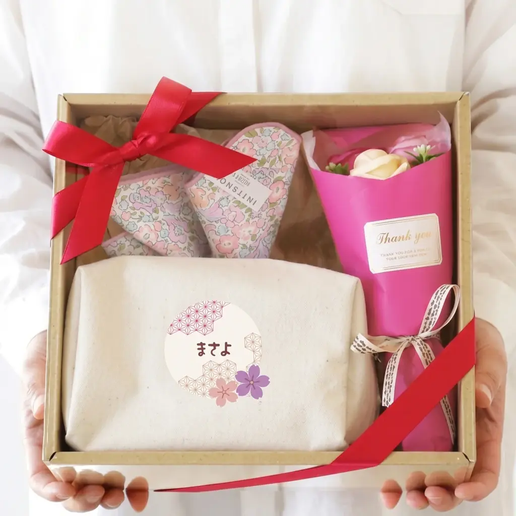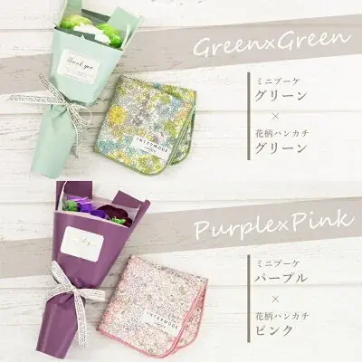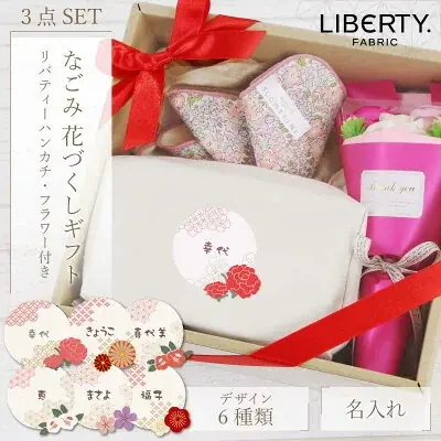 | セット内容 | ポーチ(和風花柄・名入れ可)、LIBERTY柄タオルハンカチ、ソープフラワーブーケ(観賞用) |