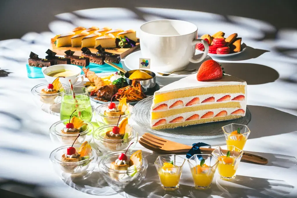 スイーツはホテルパティシエが本気で作るラインナップが揃います。中心となる巨大ショートケーキはもちろん、実演メニューや遊び心あふれるギミックで、見た目だけでなく味わいと五感の満足度にも配慮された構成です。