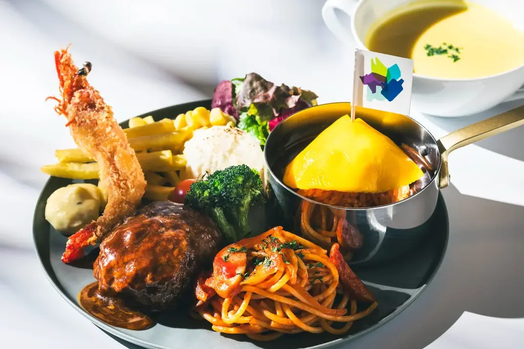 食事メニューは子どもの頃に親しんだ献立をホテルの技術で再現した内容です。自由に盛り付けて楽しめる形式で、Splishオリジナルのミニフラッグが立つオムライスなど遊び心も取り入れられています。