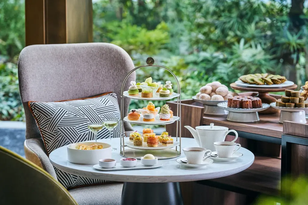 セイボリーには魚介や野菜を用いた品が並び、日本茶のオイルやソースで味を整えています。軽めの焼き菓子はトロリーで追加され、アフタヌーンティー全体の均衡を保ちます。