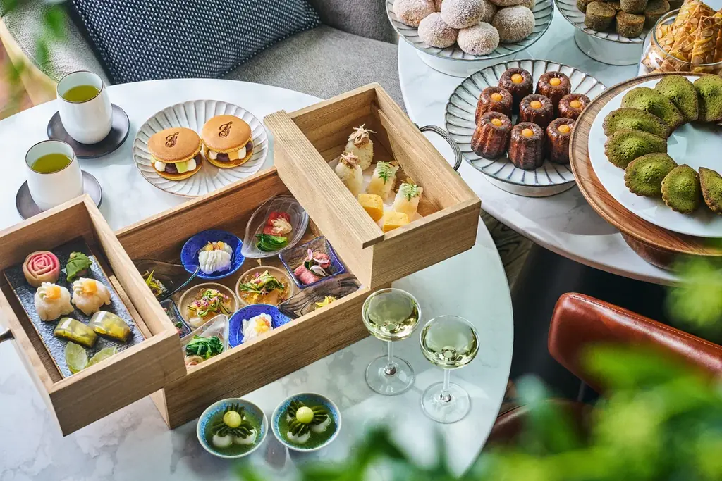 和のアフタヌーンティーは、同ホテルの鮨「みぎわ」と鉄板焼「燈辻(とつじ)」の料理長が監修したセイボリーを中心に据え、メロンと日本茶、旬食材の個性を日本の感性で描き出す構成になっています。和菓子やどら焼きなど、日本の伝統的な技法を活かした品も揃います。
