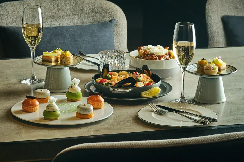 ハイティーは夕暮れから夜にかけて湾岸の景色とともに楽しむメニューで、期間限定でフリーフロー付きのプランも用意されています。アフタヌーンティーから厳選したスイーツとセイボリーに加え、カナダ由来の「プティーン」や「シーフードパエリア」など多彩な料理が提供されます。