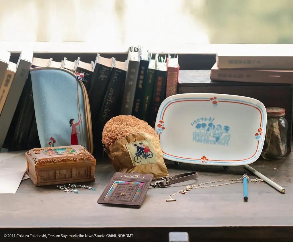 各商品には物語の細部を想起させる意匠が施されています。たとえばコロッケポーチは衣の起毛感、包み紙は紙素材で再現し、織りネームには自転車で坂を下る場面や値札のモチーフを採用。カルチェラタンをイメージしたアイテムはステンドグラス表現や年輪風の彫りを取り入れるなど、見るたびに作品を振り返らせる工夫が凝らされています。