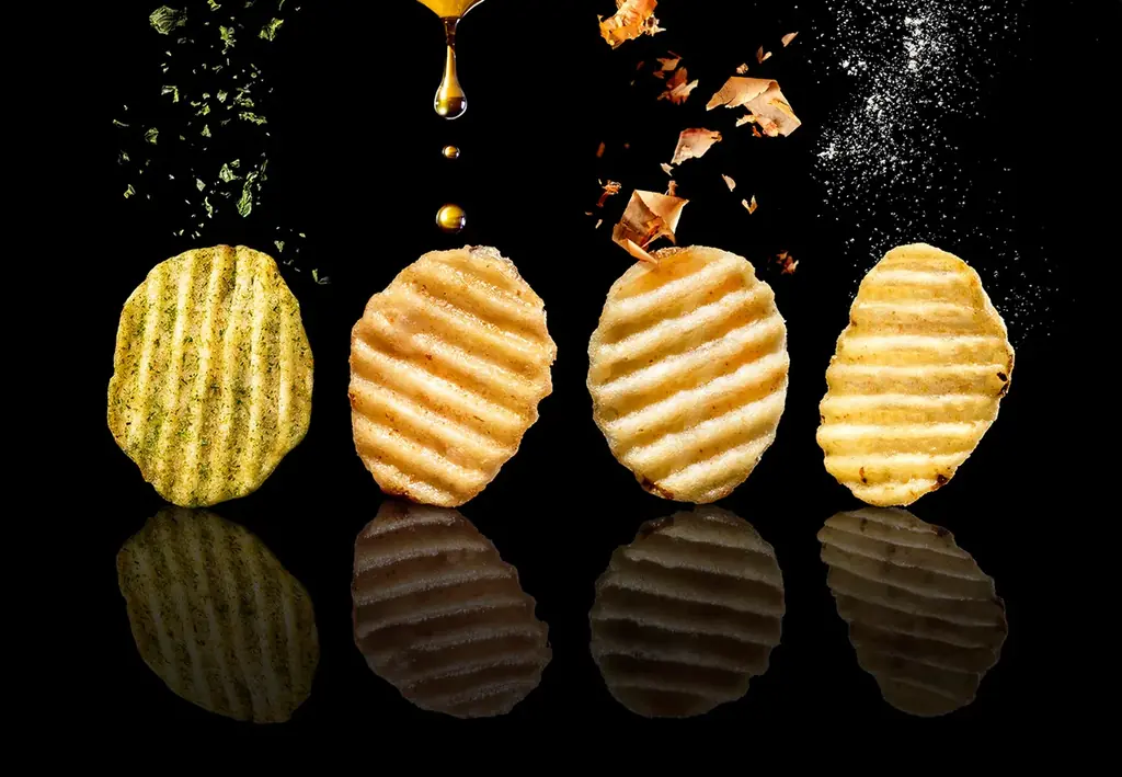 新商品は厚切りのポテトチップスに、芳醇なだしの旨味を凝縮した液(記事中では「おいしさのしずく」)をふきかける製法を採用しています。表面はパリッと、内部はサクサクとした食感を意識した仕上がりです。