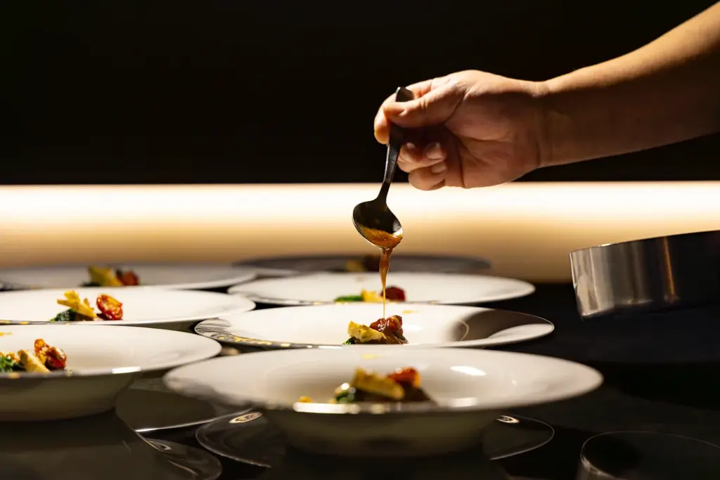 当日は会場でのライブ演出やパフォーマンスが行われ、調理や盛り付けの一部を間近で見られる演出が組み込まれています。料理と飲み物のペアリングは各皿に合わせて用意されます。