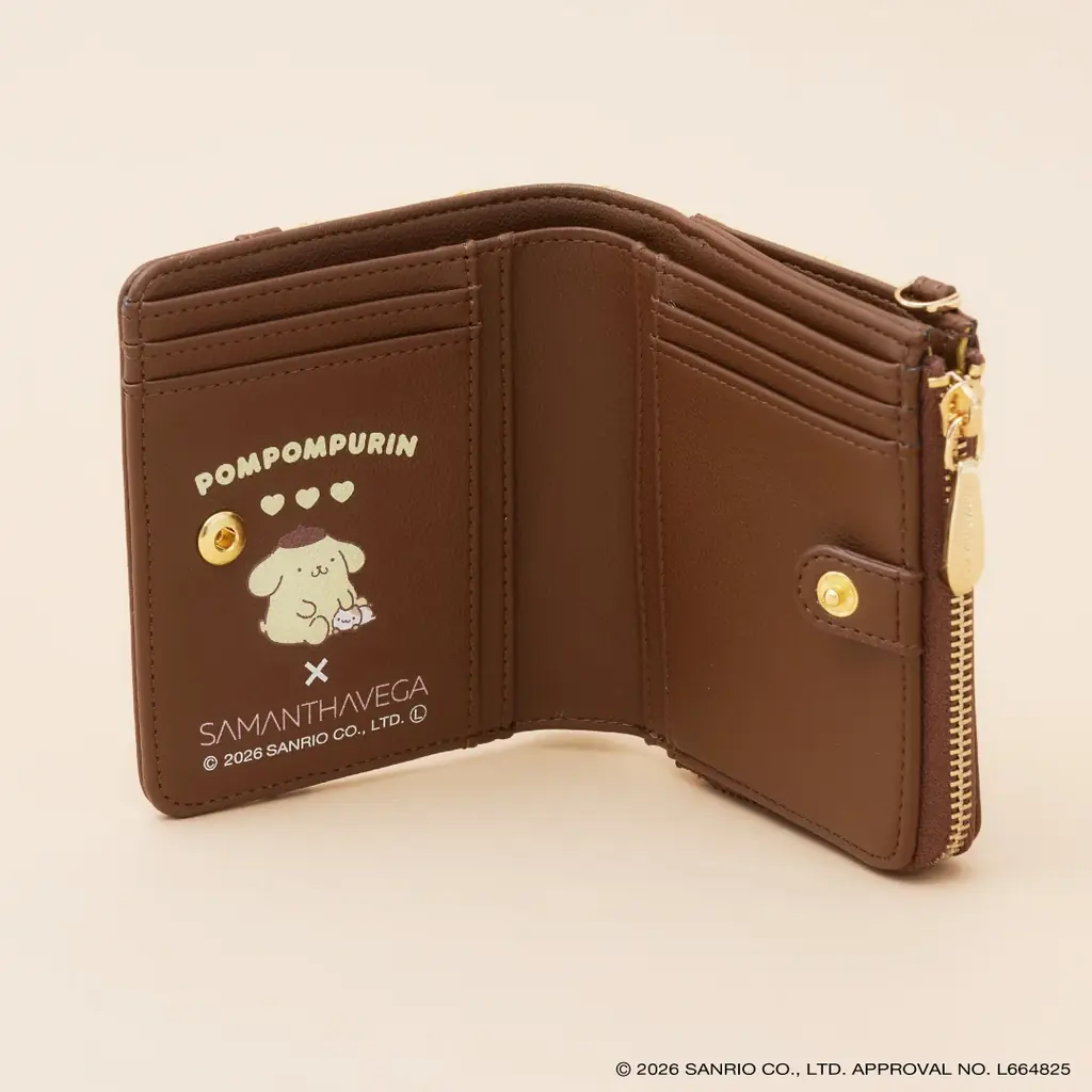 ハンドバッグとデザインをリンクさせた折財布です。外装とカード収納部にポムポムプリンのデザインが施されており、内側までキャラクターの世界観が再現されています。