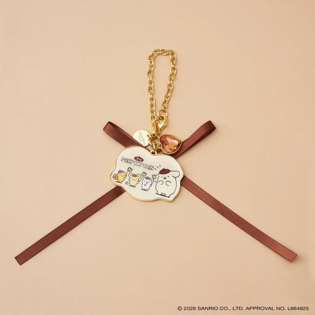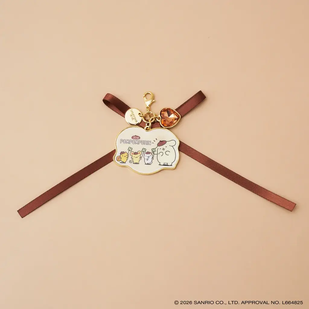 ポムポムプリンの30周年を祝う限定デザインのバッグチャームです。キラリと光るハート形のクリスタルと、お祝いをイメージしたリボンデザインがポイントになっています。