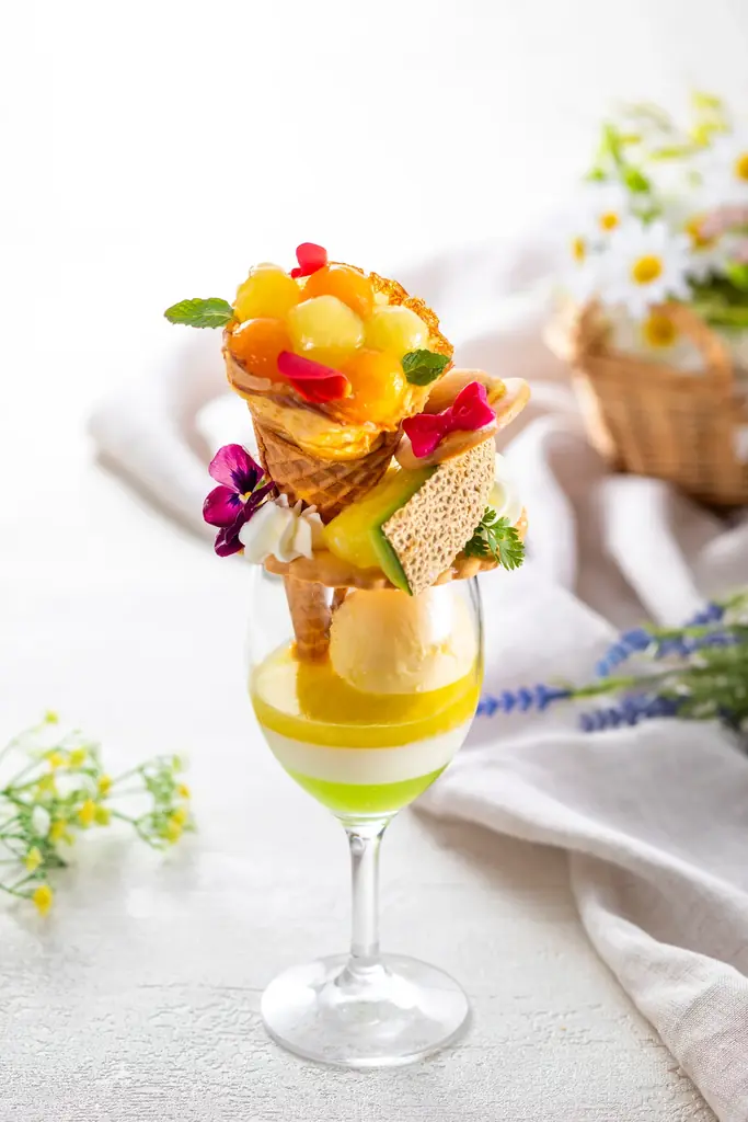 トップに配されたのは“ブーケ仕立てのメロンクレープ”。薄くふんわりとしたクレープ生地で、丸くくり抜いた瑞々しいメロンボールを包んでいます。外側には香ばしくサクサクしたコーン(ワッフルコーン等)の食感が加わり、ソフトとクリスプの対比で食感の幅を広げています。