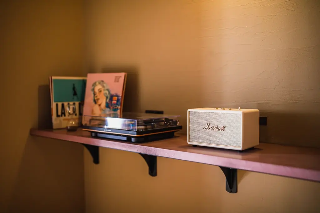 レコードプレーヤー、Marshallスピーカー、日替わりサウンドトラック、オリジナルグッズ販売