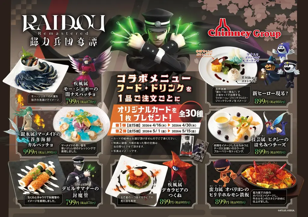 『ライドウ』シリーズ20周年×チムニーグループのコラボは、2026年4月16日(木)から一部店舗で開催されています。開催対象は東京・京都・大阪の3店舗で、コラボメニューの提供および来店特典が用意されています。