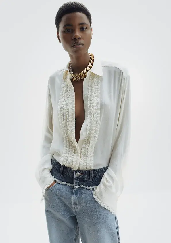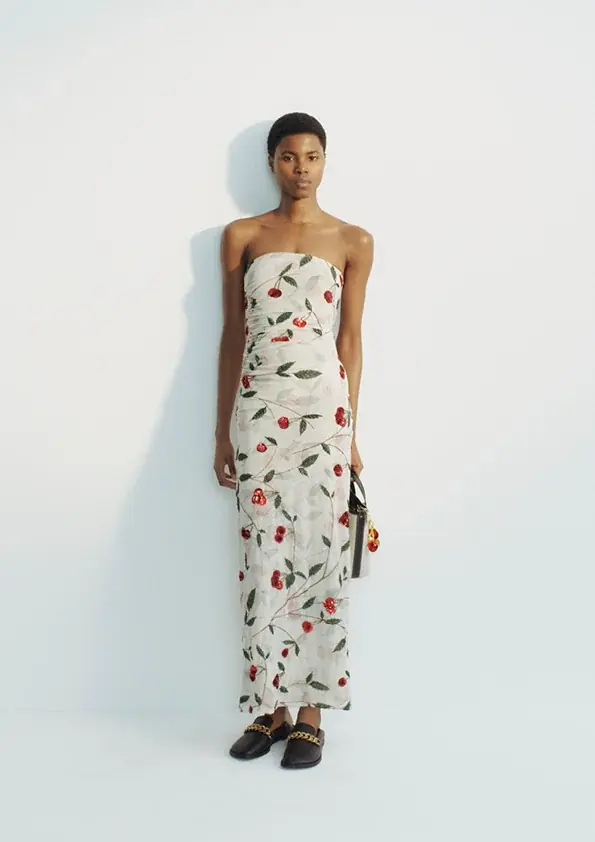 具体的には、オーバーサイズのシャツ、流れるようなシルエットのトレンチコート、シャープなテーラードジャケットといった既存の定番と、ジュエリーをプリントしたトップスやスローガン入りのアイテム、アーカイブモチーフを用いたメッシュドレスなどが組み合わされている。