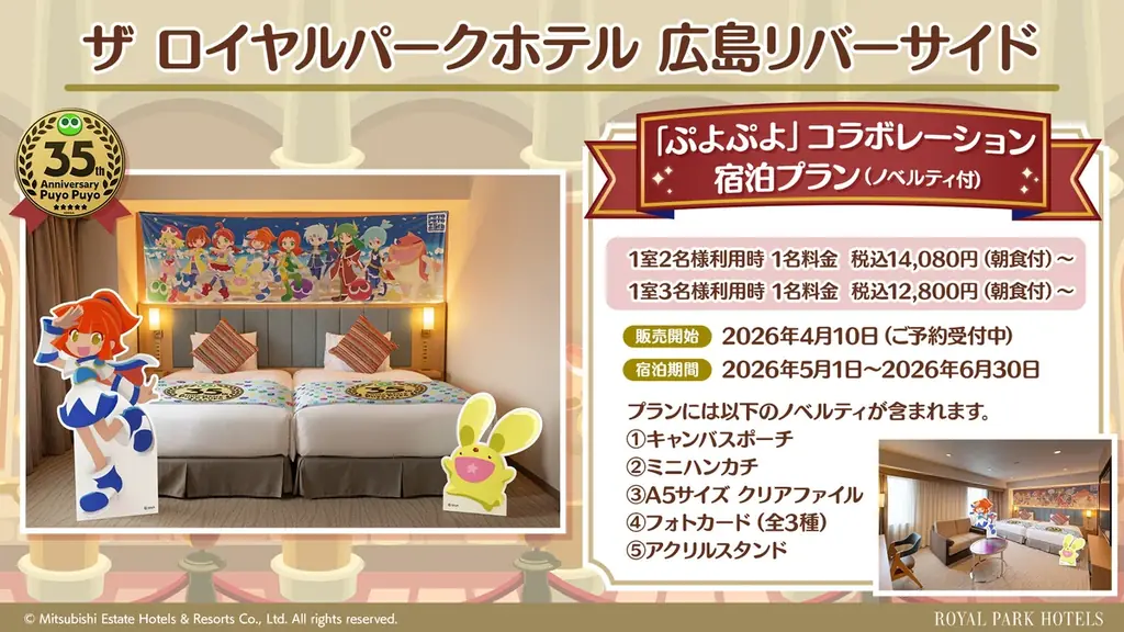 「ザ ロイヤルパークホテル 広島リバーサイド」では「ぷよぷよ」コラボルームを展開します。客室内の複数箇所に「ぷよぷよ」シリーズのキャラクターが配され、宿泊者限定のオリジナルノベルティが付いた宿泊プランが用意されています。