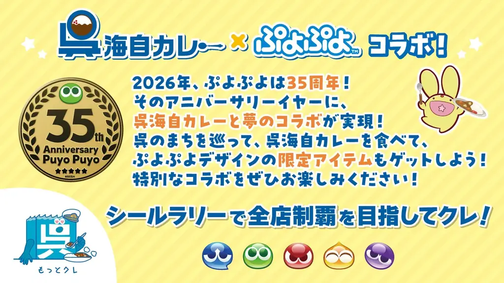 | 関連公式リンク | 35周年特設サイト:https://puyo.sega.jp/35th/ ぷよぷよポータル:https://puyo.sega.jp/portal/index.html 呉海自カレー販売ページ:https://kure-kaijicurry.com/?page_id=3487 平安堂梅坪:https://www.umetsubo.com/ |
