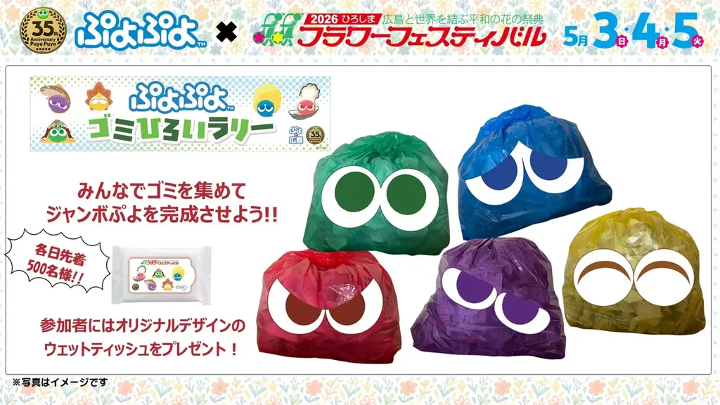 - ぷよぷよゴミひろいラリー:来場者がゴミを拾い、ジャンボぷよを完成させる参加型企画です。参加者各日先着500名に「ひろしまぷよ」とフラワーフェスティバルがコラボしたオリジナルウェットティッシュを配布します。