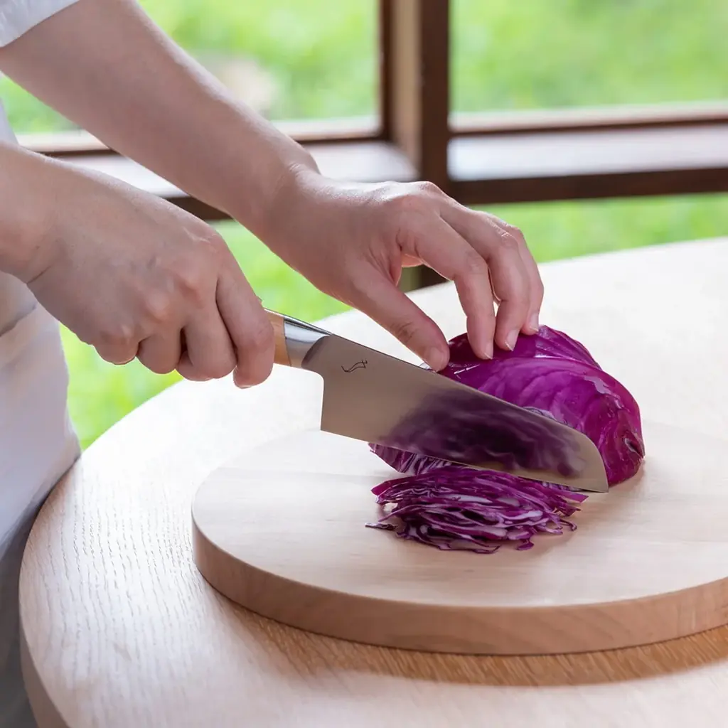 - 説明:女性の手に馴染む軽さと扱いやすさを追求した包丁「kasane(かさね)」。希少な山桜を用いたハンドルは手触りが良く、キッチンのインテリアにも映える。