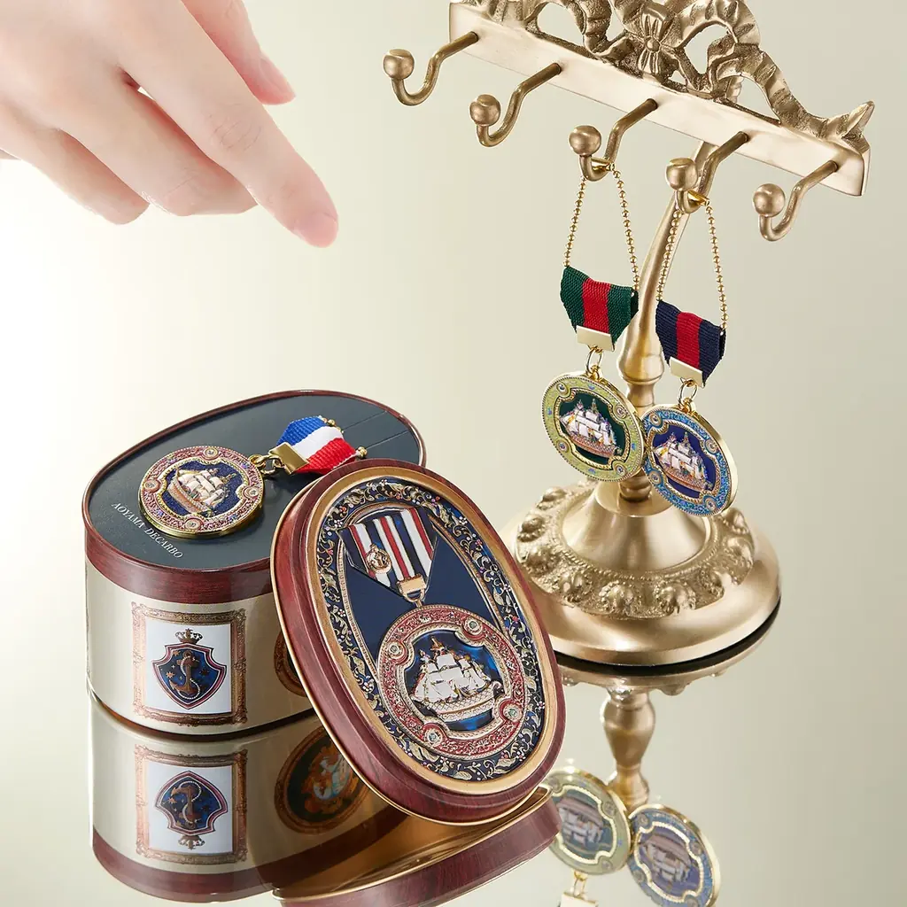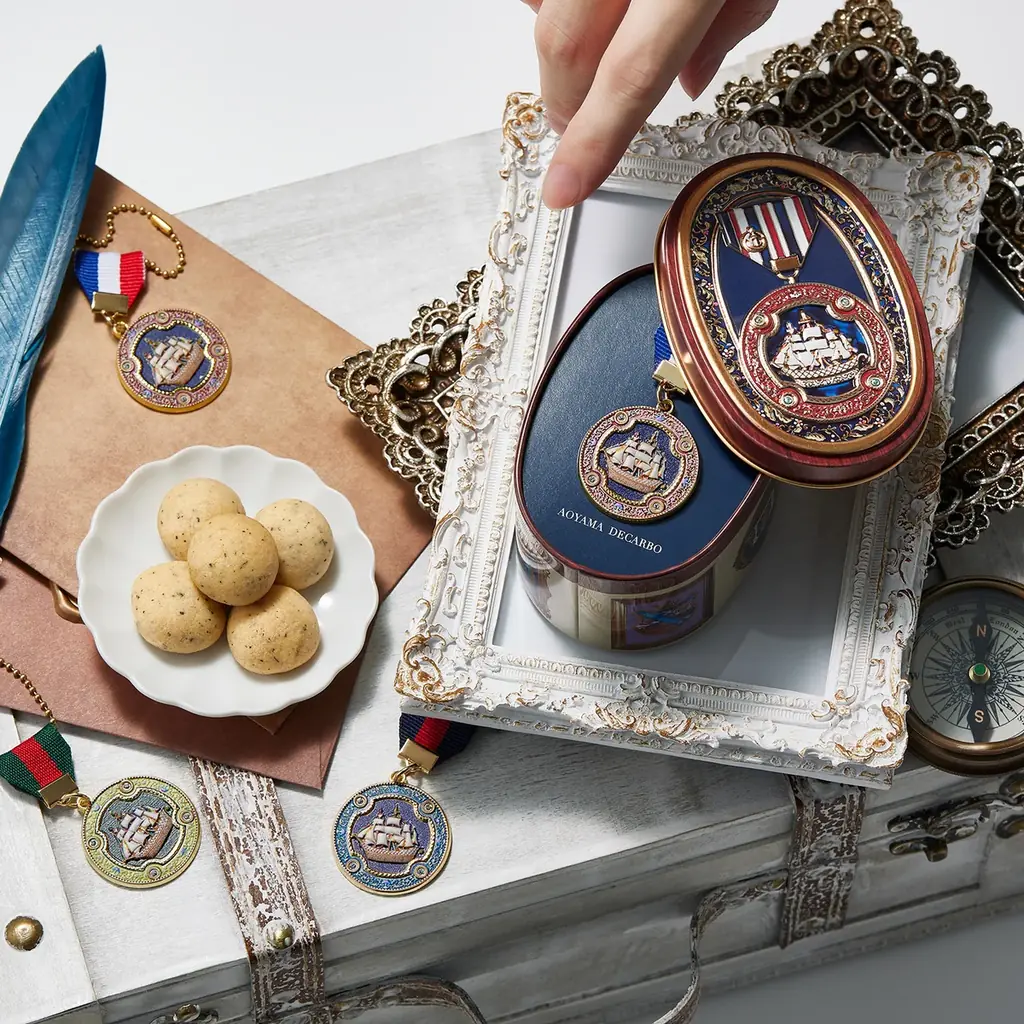 本商品の大きな特徴は、缶の蓋面に描かれたメダルデザインと同一のアンティーク風の『メダル』が缶を開けたときに現れる点です。開封という行為と、缶を手元に残すという所有体験を結びつける演出が施されています。