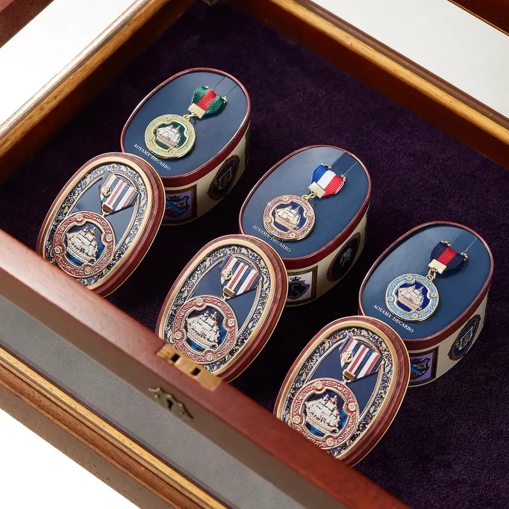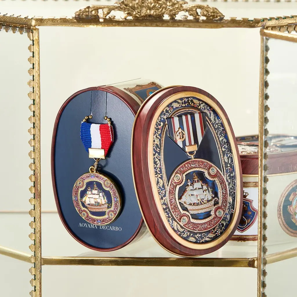 コンセプト 港の記憶を閉じ込めたアンティークメダル缶(帆船・入港盾をモチーフ)