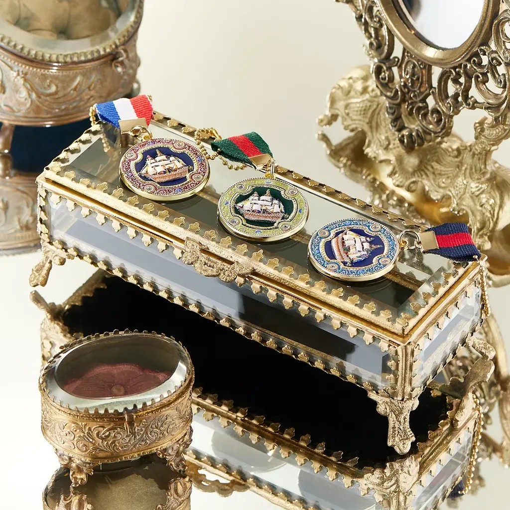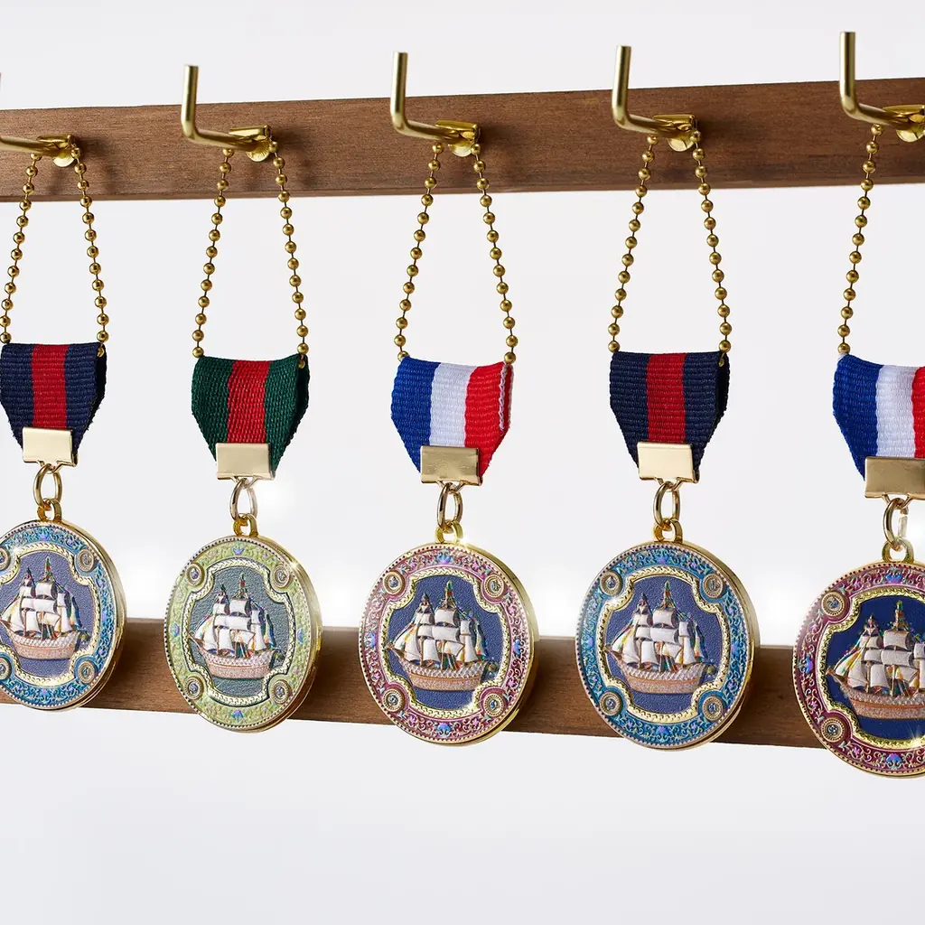 オリジナルメダルは青山デカーボが金型の段階からこだわって制作しており、帆船の細部に至るまでエンボス加工を施すことで、繊細さと重厚感を両立させた仕上がりになっています。物理的な重みや触感にも配慮された設計です。
