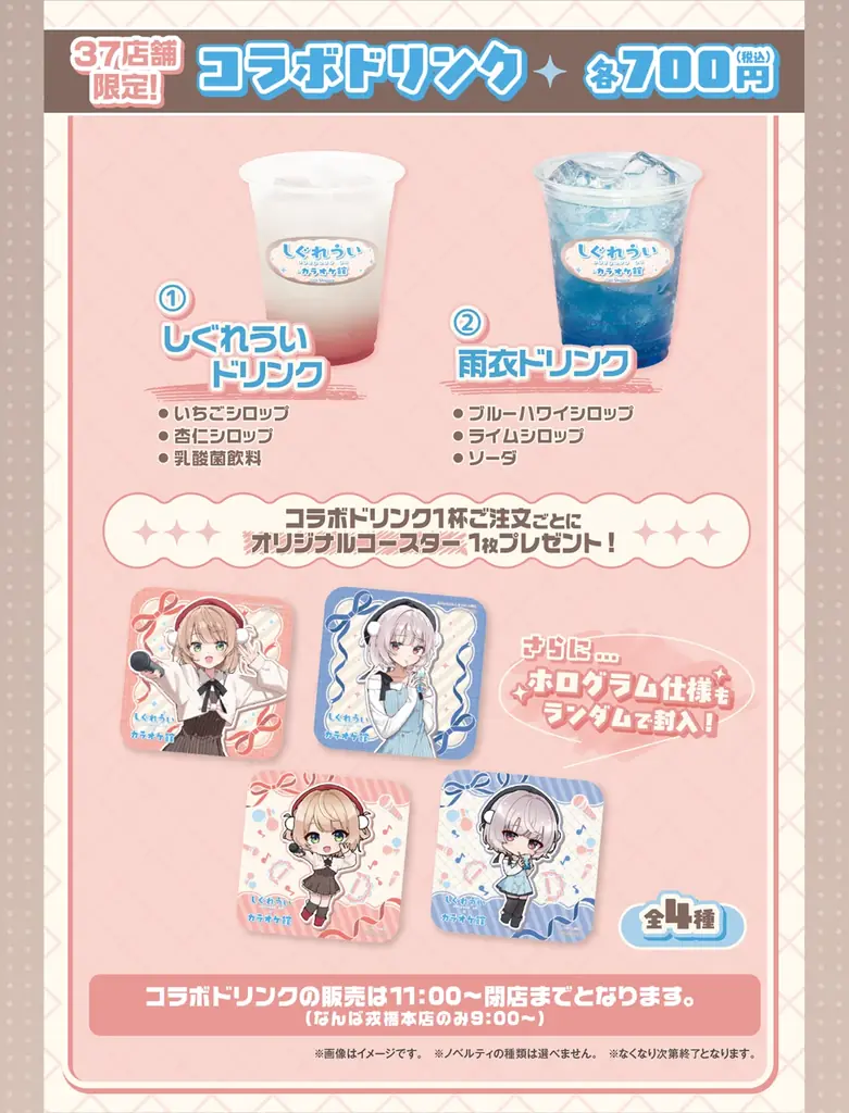 しぐれういの楽曲「雨衣」をイメージしたノンアルコールのコラボドリンクが全2種で販売されます。価格は各700円(税込)です。コラボドリンク1杯の注文ごとに、オリジナルコースター(全4種)がランダムで1枚配布されます。コースターには稀にホログラム仕様のものも含まれると明記されています。