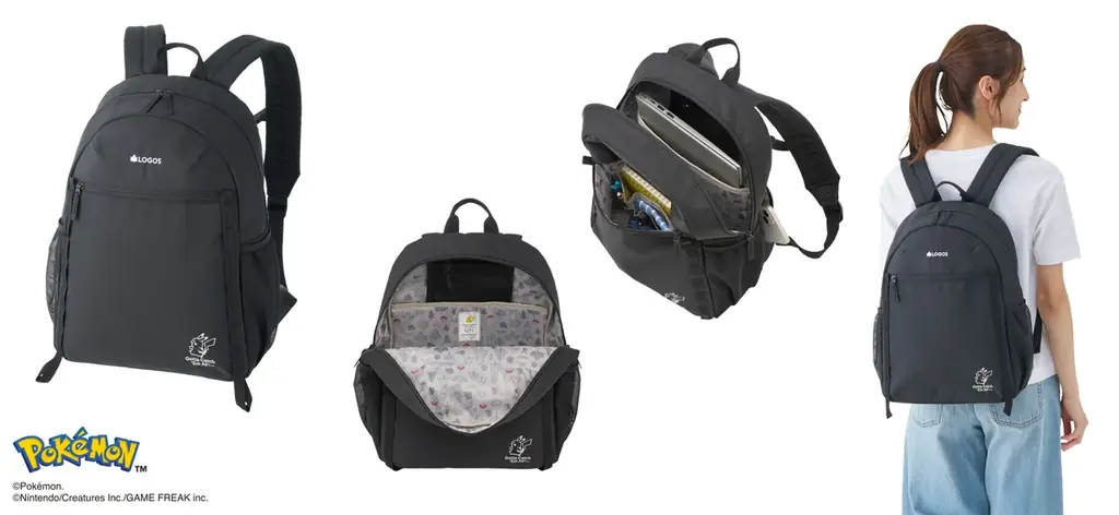 男女問わず使いやすい容量20Lのリュックサックです。生地表面には撥水加工が施され、チェストベルトで肩の負担を軽減する設計、14インチ対応のPCポケット、小物の取り付けに便利なデイジーチェーンなどを備えています。外観はフロントにピカチュウ刺繍、内側は自然モチーフとポケモンのシルエットを散りばめた総柄デザインです。