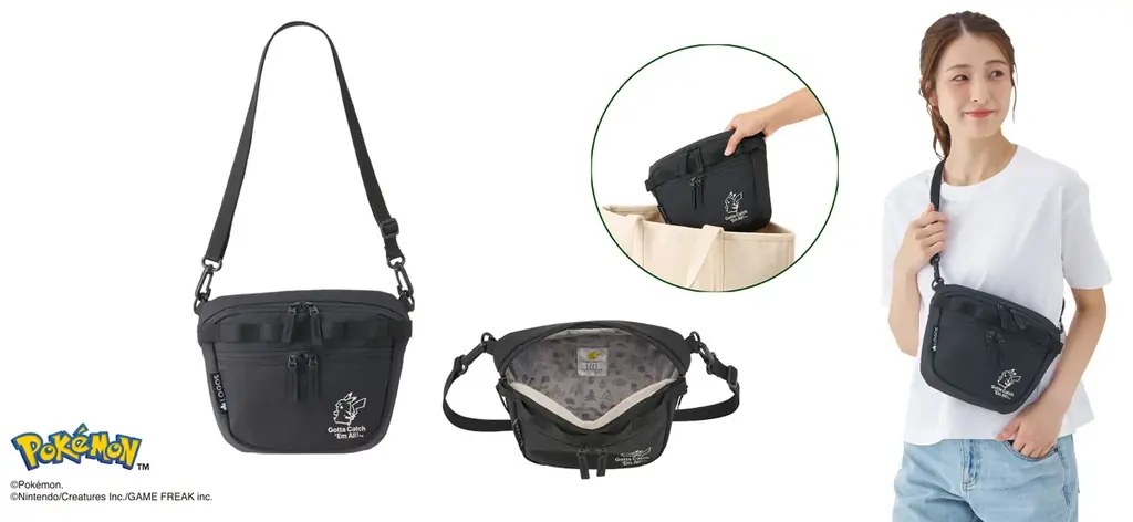 500mlペットボトルが収納できる容量と、ショルダーベルトを取り外してポーチとしても使える柔軟性が特徴のショルダーバッグです。撥水加工が施されており、収納に便利なポケットとカラビナを付けられるループベルトを搭載しています。フロントにはピカチュウ刺繍、内側は総柄デザインです。