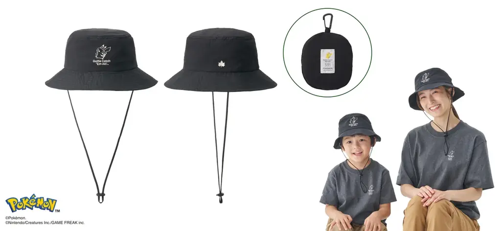 小さく折りたためて持ち運べるポケットハットは、大人用(頭周り:約58cm)とキッズ用(頭周り:約54cm)の2サイズ展開です。生地にはピカチュウとLOGOSのロゴマークであるメイプルリーフの刺繍が施されています。一体型の収納袋はカラビナ付きで、カバンやリュックに引っ掛けて携帯可能です。生地は軽量でシワになりにくいナイロンを採用しています。
