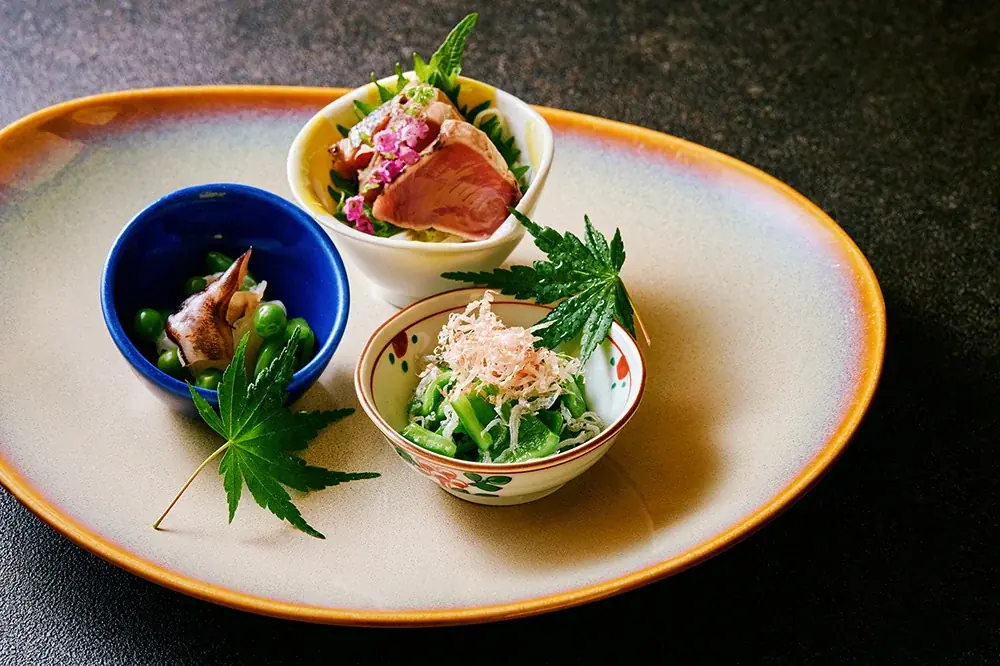 コースはまず「おすすめ旬の小鉢3種盛り合わせ」から始まります。小鉢三種は旬の鰹を使ったタタキ、トリガイと烏賊を合わせた一品、そして万願寺とうがらしを用いた和の小鉢で、いずれも素材の鮮度と季節感が重視されています。