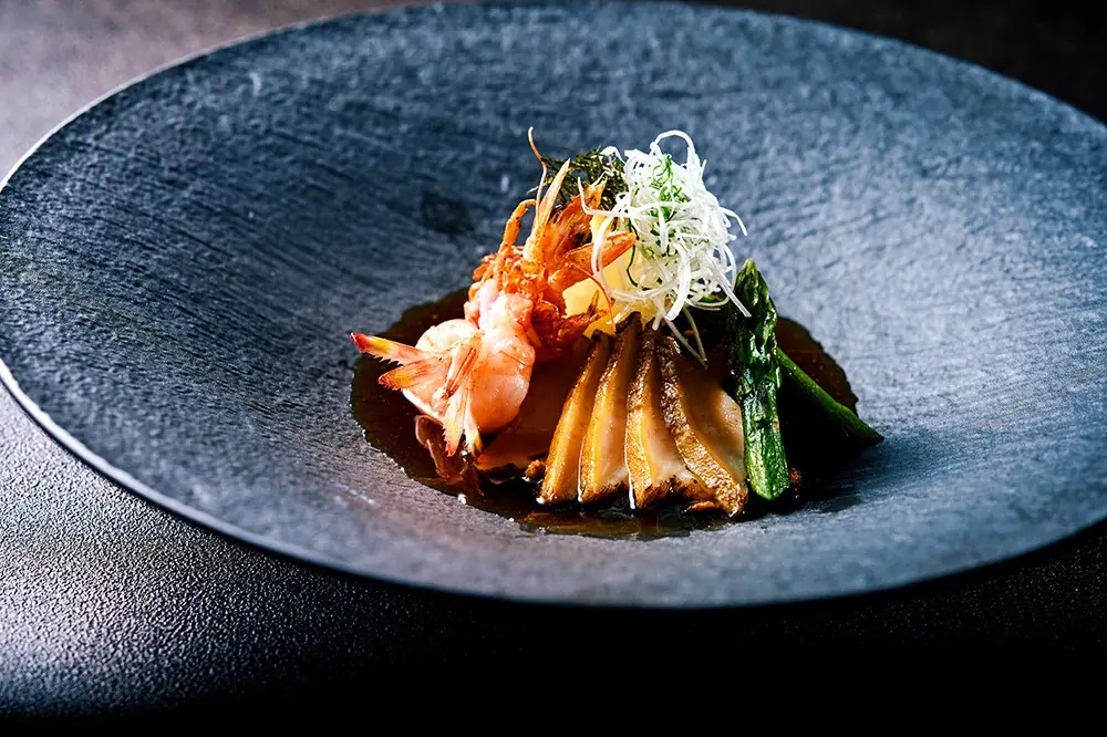 さらに、活鮑、才巻海老、賀茂なすをしぎ焼き仕立てで提供します。しぎ焼きは素材に合わせた焼き方で、それぞれの食感と旨味を生かす技法が使われ、海の幸と京野菜の組み合わせにより季節感が強調されます。