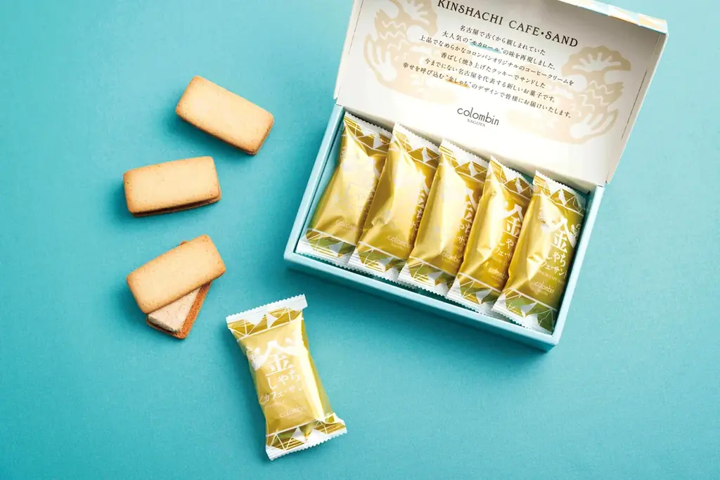 コロンバンが掲げる「さくさく、濃く濃く」というコンセプトのもと、上品でなめらかなコロンバンオリジナルの濃厚コーヒークリームを、香ばしく焼き上げたサクサクのクッキーで挟む構成になっています。商品名にある「金しゃち」は幸せを呼び込む縁起物の象徴としてデザインに採用され、名古屋の土産物としての位置づけも明確です。