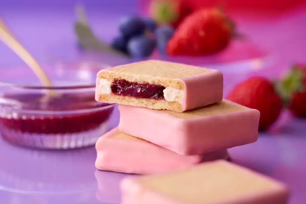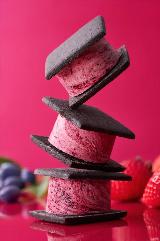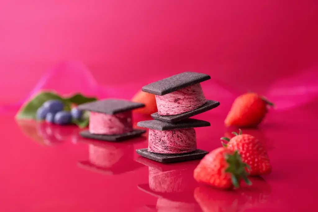- 商品説明:いちごのバタークリームにハスカップジャムを混ぜ合わせてマーブル状に仕上げたバターサンド。ココアクッキーの黒色にマーブルが映えるビジュアル。