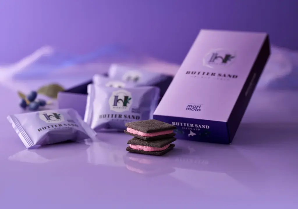 - 商品説明:ハスカップのジャム、ホワイトチョコ、北海道バターを合わせたバタークリームをココアクッキーでサンド。ハスカップの鮮やかな紫色とココアクッキーのコントラストが特徴。