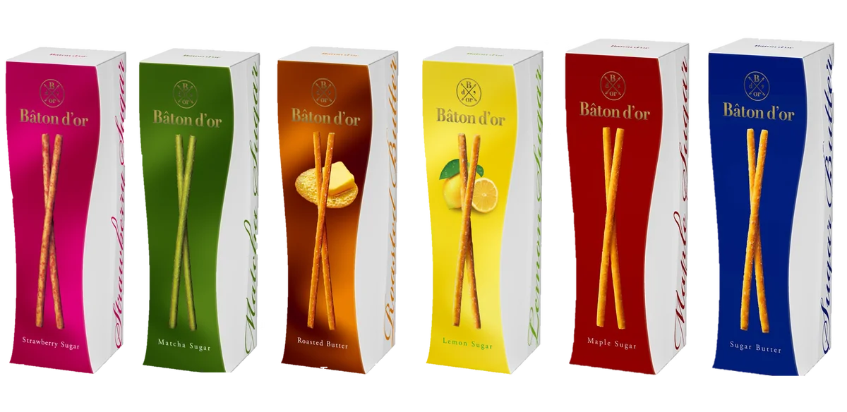 内容: “澄ましバターの黄金スティック”をコンセプトにしたプレッツェル系スイーツを販売します。バターをふんだんに練り込んだ生地をじっくり焼き、発酵バターを加えた澄ましバターをしみ込ませることでバターリッチな味わいに仕上げられています。関西のお土産として推奨される商品構成です。