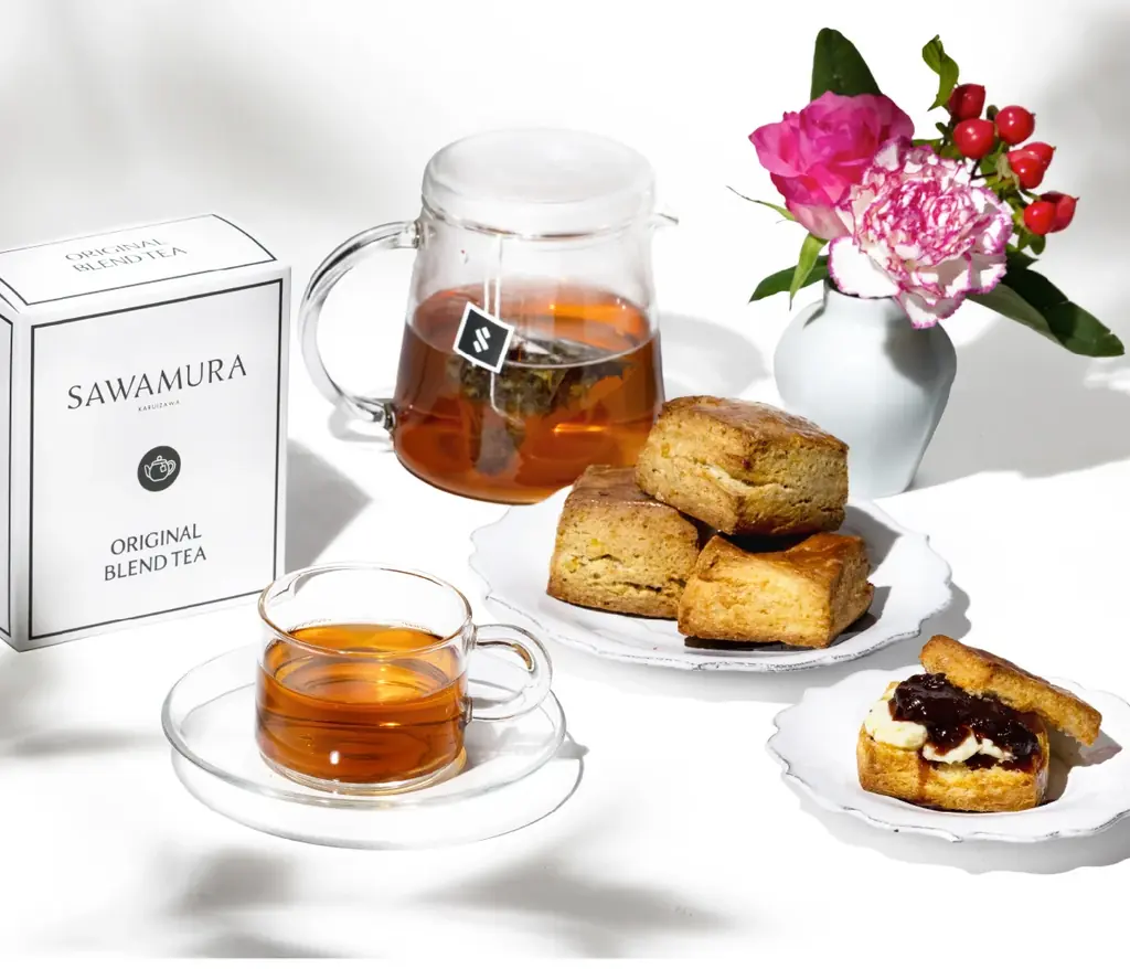 紅茶とともに楽しむことを想定したセットで、しっとりとした口どけのスコーン2種類と、沢村が用意する選べる紅茶が含まれます。紅茶はストレートでもミルクを入れても楽しめるアールグレイ、あるいはノンカフェインのエルダーフラワールイボス(マスカットのような香りが特徴)から選べます。