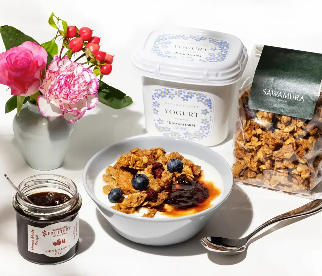 自家製パンを原料とした雑穀入りのオリジナルグラノーラを中心に、搾りたてのミルクを使ったヨーグルト、そして沢村のフルータリーシリーズから選べるジャムを組み合わせたセットです。ジャムはフルーツの自然な甘さと香りを重視しており、「フルータリー いちごとバルサミコのジャム」(大粒で上品なストロベリーをふんだんに使用、バルサミコとリキュールで仕上げたもの)を含む全5種類の中から選べます。