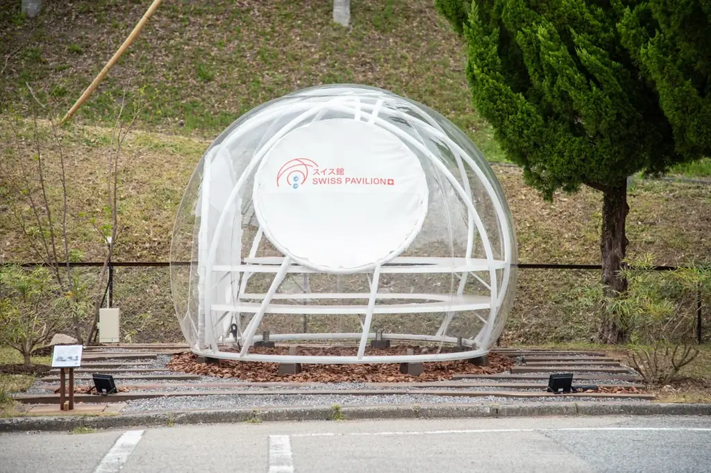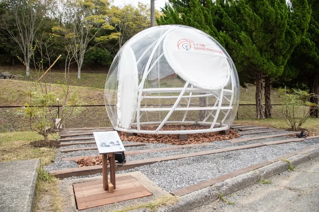 大阪・関西万博のスイス館は、複数の球体が重なり合う印象的な建築デザインが特徴です。今回移設されたモニュメントはそのうち来場者を迎えるエントランスに設置されていた球体で、設計上は合成樹脂とポリ塩化ビニール(PVC)の2種類の膜を重ねた二層構造で構成されています。