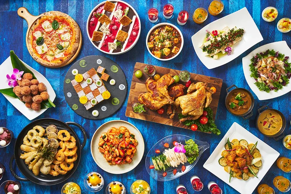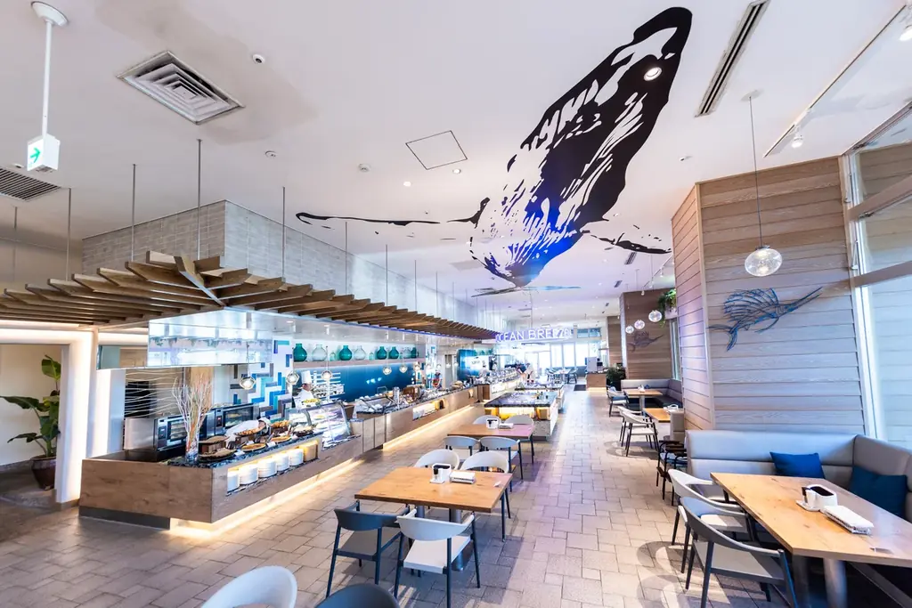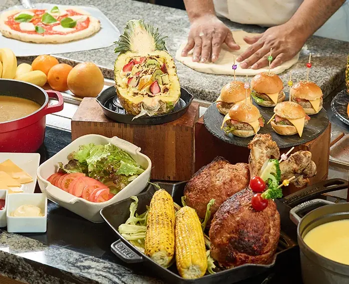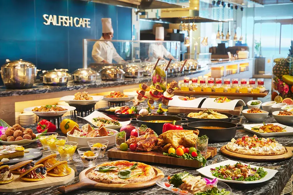 セイルフィッシュ カフェはライブキッチンを備え、シェフが目の前で調理するスタイルが特徴です。石窯で焼くピザや焼き立てパンに加え、和洋中の多彩な料理とスイーツが並びます。キッズコーナーやデザートコーナーも充実しています。