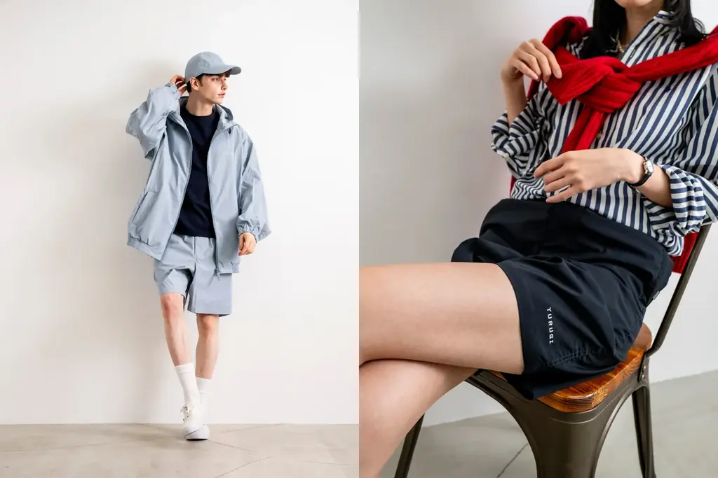 今回のリリースでは、見た目の軽やかさに加え、紫外線対策や撥水性、抗菌防臭機能といった実用的な仕様が特徴です。素材感は一般に「シャカシャカ」と呼ばれるナイロン系の軽量生地を想起させるもので、セットアップでも単品でも組み合わせやすいアイテム群です。