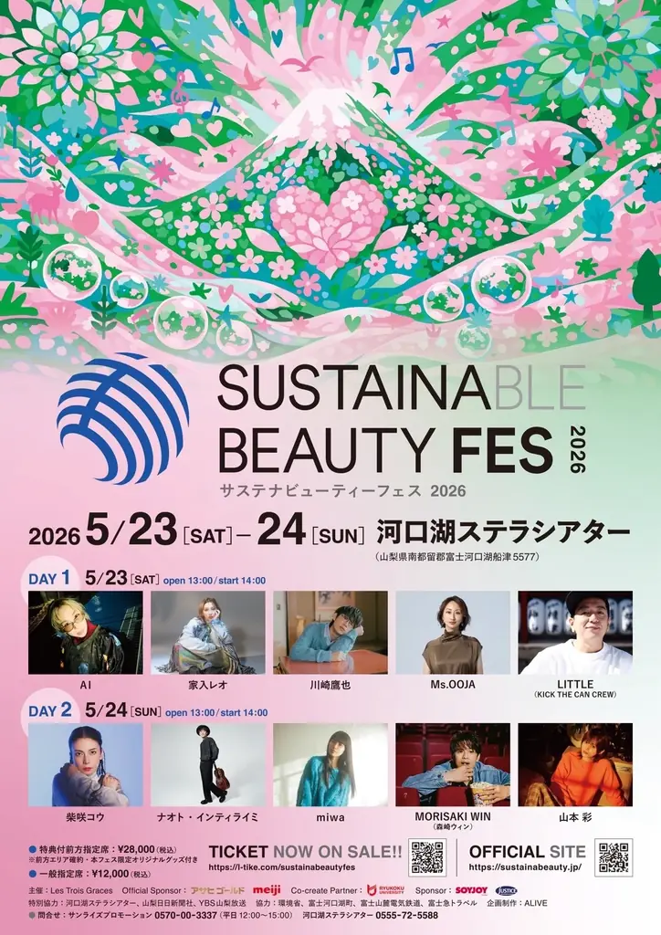 SUSTAINABLE BEAUTY FES 2026は2026年5月23日・24日、河口湖ステラシアターで開催。特典付前方指定席¥28,000、一般指定席¥12,000。富士急河口湖駅からシャトルバスや臨時列車利用で約10分です。