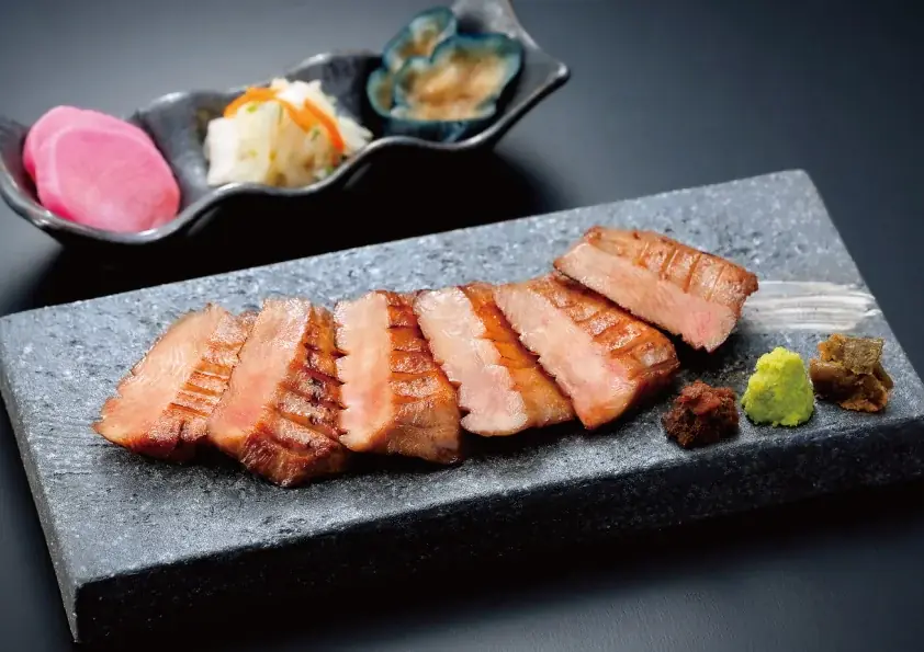利久は定番の牛たん焼に加え、希少な和牛の牛たん焼や神戸牛、宮城のブランド和牛・仙台牛など、多彩な和牛を用いたメニューを用意しています。希少価値の高い食材を丁寧に仕込み、炭火で焼き上げる調理法が強調されています。