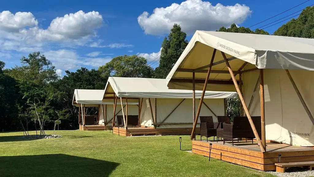 ウッドデザインパーク瀬戸は「懐かしさとあたたかさに包まれる時間」をコンセプトに、グランピングテント、BBQ設備、御飯処、合掌造りの家やワークショップエリアを備えたアウトドア施設です。自然の中で手ぶらでBBQが楽しめるほか、焚き火を囲んで静かな時間を過ごすなど、非日常的な体験が用意されています。