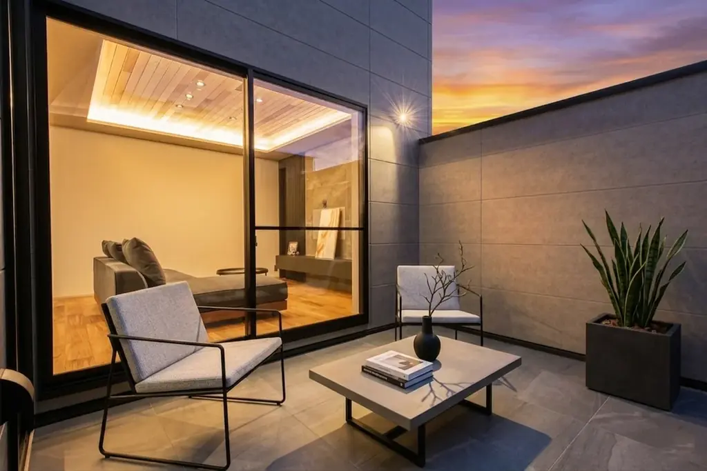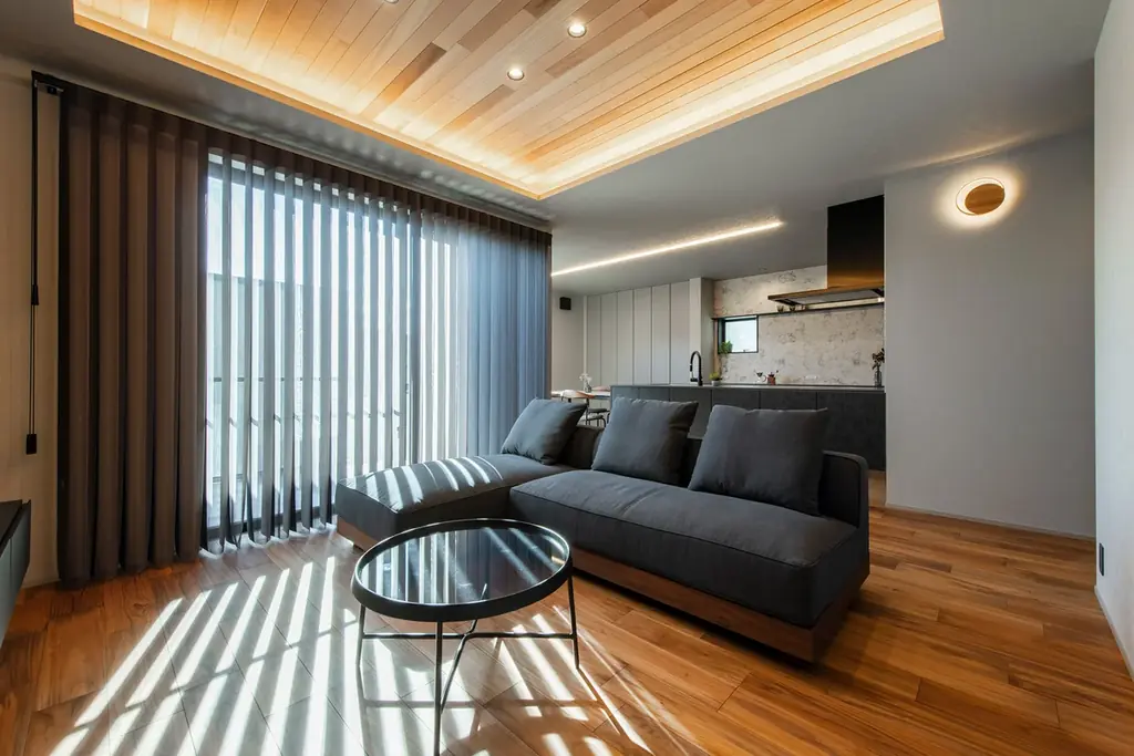 リビング・ダイニング・キッチン(LDK)は21.5帖の広さを確保し、天井の間接照明と無垢フロアが調和するホテルライクな空間に仕上げられています。LDKからフラットに続く5帖のコンクリートテラスは、周囲の視線を遮る設計で屋外でありながらプライバシーが守られる「第二のリビング」として機能します。