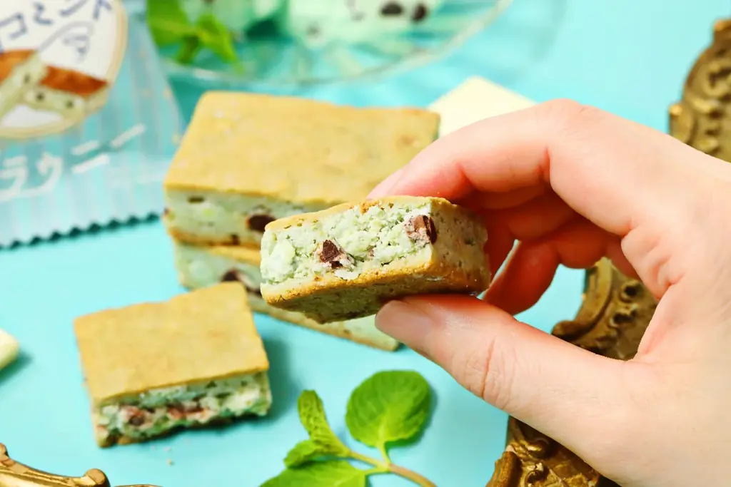 強い清涼感が苦手な人でも楽しめる設計になっており、黒いチョコミントブラウニーと食べ比べることで、風味や爽快感のコントラストを明確に感じ取れます。食感面ではこちらもチョコチップのザクザク感がアクセントになります。