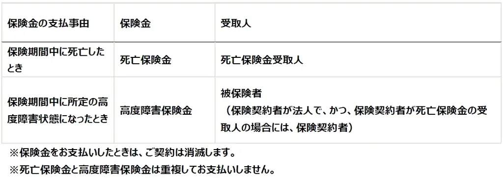 | 重要な留意点 | 死亡保険金と高度障害保険金は重複支払不可、保険金支払で契約消滅、解約返戻金に最低保証なし(10年未満は解約控除) |