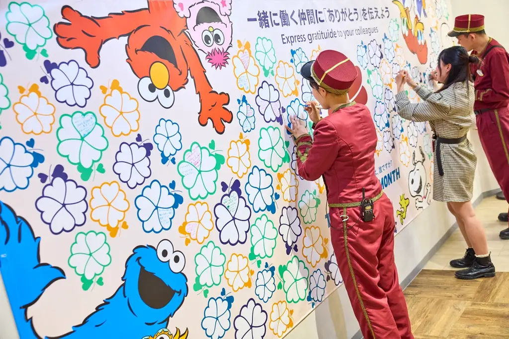 社内でも感謝を言葉で伝える文化を促進するための取り組みが行われます。ユー・エス・ジェイの社員間では大型バナーを用いたキャンペーンを実施し、メッセージカードに見立てた花びら一枚一枚に同僚への感謝の言葉を綴る形式を採用しています。