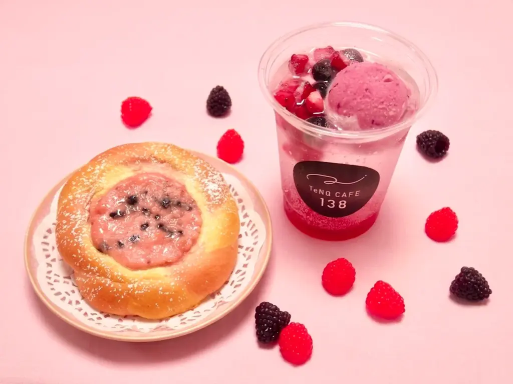 カフェメニュー TeNQ ベリーソーダ 730円、TeNQ ベリーベリーパン 490円(期間限定)