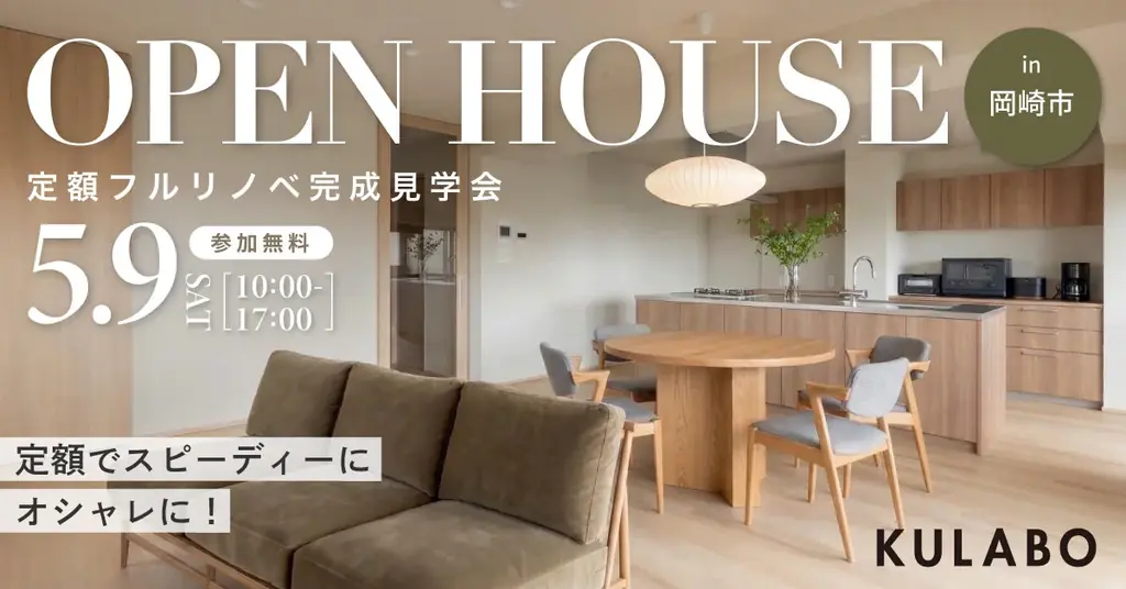愛知県名古屋市のリノベーションスタジオKULABO(運営:株式会社sumarch)は、定額制フルリノベプラン『LIBEDY(リビディ)』を用いて施工したマンションリノベーションの完成見学会を、2026年5月9日(土)に愛知県岡崎市で開催します。プレスリリースは2026年4月21日付で発表されました。