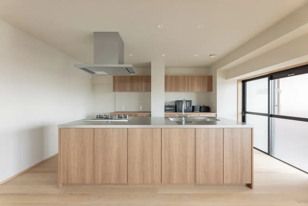 空間の中心にはアイランドキッチンを配し、キッチンを軸に回遊できる導線を確保しています。複数人での作業や配膳がスムーズに行えるだけでなく、生活導線の短縮にも効果を発揮します。